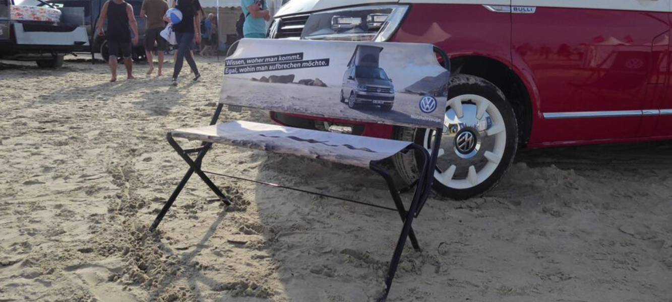 Die faltbare Sitzbank kann vollflächig bedruckt werden und sorgt so für eine deutliche Verbesserung der Markensichtbarkeit sowohl bei Veranstaltungen wie auch am Point of Sale. Durch den 90-Grad-Winkel der Rückenlehne ist die Werbebotschaft perfekt sichtbar. Darüber hinaus ist die faltbare Sitzbank mobil, ultraleicht, platzsparend verstaubar sowie in 10 Sekunden einfach werkzeuglos aufgestellt.